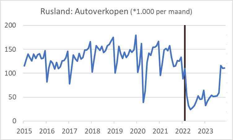 Autoverkopen zijn vaak een interessante indicator van economische bedrijvigheid. Die verkopen waren in de pandemie al enigszins in mineur. Na het uitbreken van de oorlog stortten ze in, maar sinds het midden van dit jaar is sprake van een duidelijk herstel.