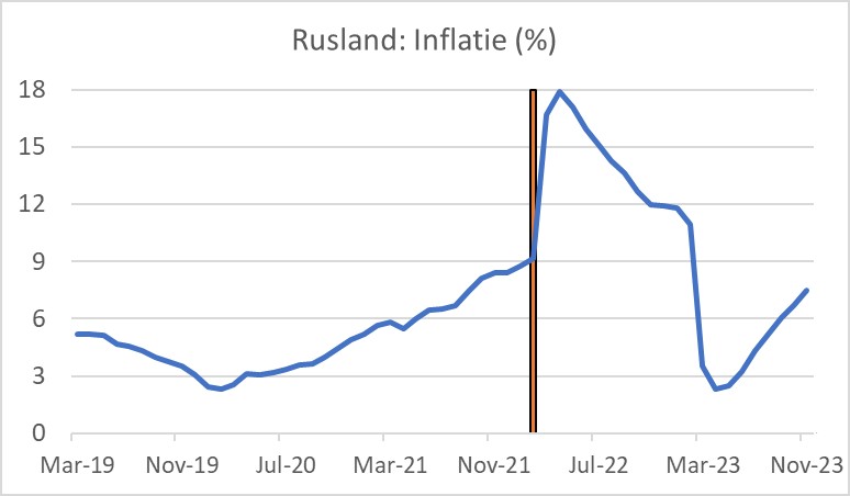 De inflatie nam na het uitbreken van de oorlog direct sterk toe. Alert beleid van de centrale bank en wellicht ook de economische krimp in het tweede kwartaal vorig jaar drukten de inflatie echter al snel weer naar beneden. Sinds april dit jaar loopt de inflatie echter weer op. In november bedroeg deze 7,5%, ruim boven de 4%-doelstelling van de centrale bank.
