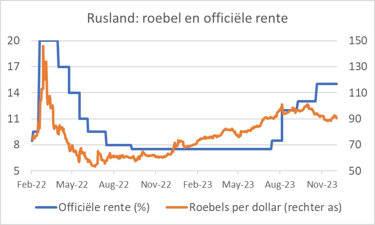 Toen de oorlog uitbrak halveerde de waarde van de roebel op de valutamarkt in korte tijd. De centrale bank nam snel actie. De rente werd zeer fors verhoogd en er werd een regime van deviezenreglementering ingesteld, waardoor het veel moeilijker werd voor Russische burgers en bedrijven om geld het land uit te sluizen. Dit beleid was buitengewoon effectief. De roebel herstelde snel en was zelfs een poos sterker dan voor de oorlog. Doordat ook de inflatie daalde kon de centrale bank de rente in de loop van 2022 in een redelijk rap tempo weer verlagen.
