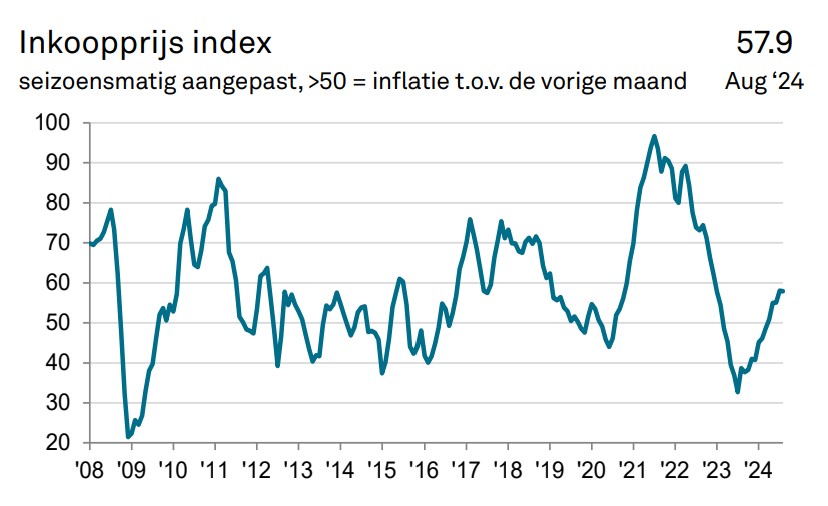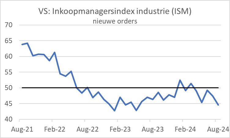 Ook in de VS staat de industrie er niet heel florissant voor. De ontwikkeling van het productievolume is er minder negatief dan bij ons, maar inkoopmanagers zijn niet positief. Volgens cijfers van het toonaangevende Institute for Supply Management zijn de Amerikaanse inkoopmanagers in augustus ook weer somberder geworden over hun orderontvangsten. Economen kijken graag naar de ontwikkeling van orders omdat die reeks een blik vooruit biedt op de productie.