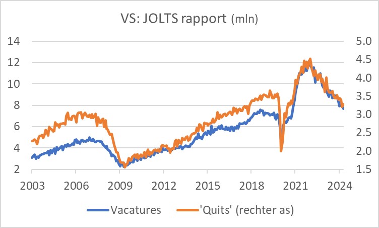 De spanning op de Amerikaanse arbeidsmarkt neemt snel af. In maart 2022 werd een record van 12,2 miljoen vacatures gemeld. In juli dit jaar waren dat er nog 7,7 miljoen. Nog veel natuurlijk, maar de daling gaat snel en het niveau is nu vergelijkbaar met dat van voor de pandemie. Ook het aantal mensen dat uit eigen beweging vertrekt bij hun werkgever (quits) daalt snel. Dat is een teken dat ze minder optimistisch zijn over het snel vinden van een nieuwe baan, wat op ontspanning van de arbeidsmarkt duidt.
