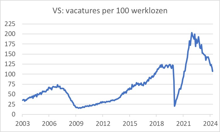 De spanning op de arbeidsmarkt wordt vaak afgemeten aan de verhouding tussen het aantal vacatures en het aantal werklozen. Ook dat cijfer laat een snelle afkoeling van de arbeidsmarkt zien. In maart 2022 waren er 203 vacatures per 100 werklozen, nu nog 107. Dat laatste cijfer ligt iets onder het niveau van vlak voor de pandemie.