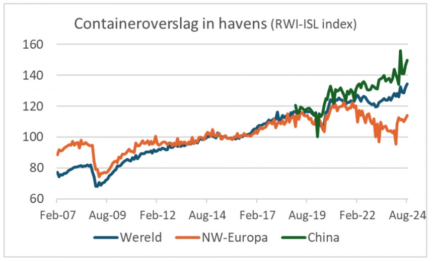 De wereldhandel lijkt wat aan te trekken. De Duitse instellingen RWI en ISL houden de overslag in een groot aantal havens wereldwijd in de gaten. Zij berekenden dat er in augustus wereldwijd 1,7% meer containers werden overgeslagen dan in juli. Ten opzichte van een jaar eerder bedroeg de stijging zelfs 8,4%, al dient gezegd dat deze cijfers volatiel zijn. Noordwest-Europa blies een aardig partijtje mee: maand-op-maand bedroeg de stijging 2,2%, jaar-op-jaar 9,4%. Dat is zeer welkom want Europa was eerder fors achtergebleven. Ook China kon overtuigende cijfers overleggen: 2,2% maand-op-maand en 8,9% jaar-op-jaar.