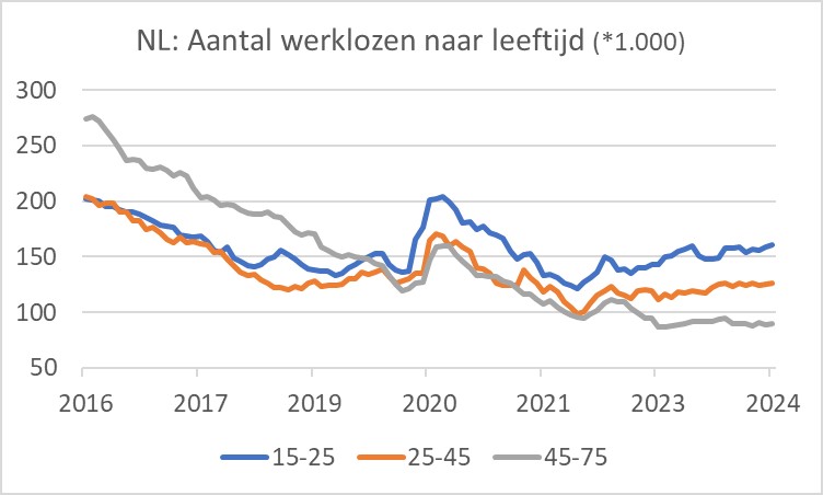 De eerste grafiek laat zien dat die stijging vooral komt door jeugdigen. Ik behoor tot de groep der allersterksten – in de grafiek toepasselijk met een grijze lijn weergegeven – en bij ons is van stijgende aantallen werklozen nog niet veel te zien.