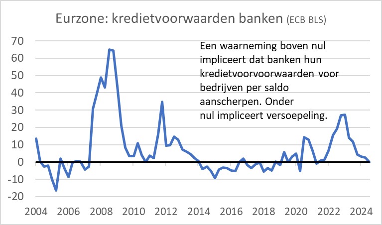 De ECB kwam met beter nieuws. De zogeheten Bank Lending Survey, een enquête die de ECB elk kwartaal onder ruim 150 Europese banken houdt, laat zien dat het kredietproces zich versterkt. Voor het eerst in twee jaar ervaren banken weer een toenemende kredietvraag door bedrijven. Het niveau van de rente wordt niet langer als een belemmering ervaren en ook lijkt een daling van de kredietvraag ten behoeve van het doen van investeringen ten einde. Hoera!
