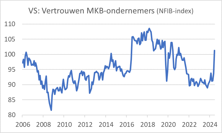 Of het optimisme onder MKBers terecht is, zullen we zien. De onzekerheden zijn aanzienlijk. De mogelijke invoertarieven kunnen de inflatie een nieuwe impuls geven. Een andere grote onzekerheid is hoe succesvol Elon Musk zal zijn in het efficiënter maken van het overheidsapparaat. In ieder geval is het interessant om te zien hoe het een harde en extreem succesvolle zakenman zal vergaan in die rol. Voor Trump hangt daar veel vanaf want de besparingen die Musk weet te realiseren zullen nodig zijn om te voorkomen dat de overheidsfinanciën verder uit de hand lopen. Als de voorziene besparingen niet gerealiseerd worden en de federale tekorten oplopen, dan zou de obligatiemarkt budgettaire discipline kunnen afdwingen door een stijgende kapitaalmarktrente. Dan zou de economische groei een knauw krijgen. Dat lijkt mij echter eerder een risico dan het basisscenario.