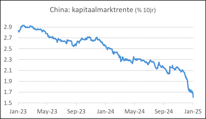Tekenend is waarschijnlijk de ontwikkeling van de kapitaalmarktrente in China. Vooral in de laatste maanden heeft die een duikvlucht ingezet. Dat is ongetwijfeld niet een teken van economische weelde.