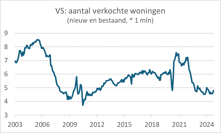 Ook de huizenmarkt, normaal gesproken een bron van dynamiek, laat het behoorlijk afweten. De rente is weliswaar in 2024 gedaald, maar nog altijd veel hoger dan een paar jaar geleden. Desondanks zijn de huizenprijzen gestegen. Deze combinatie leidt tot een daling van de betaalbaarheid van woningen en dat heeft zijn weerslag op het aantal transacties.