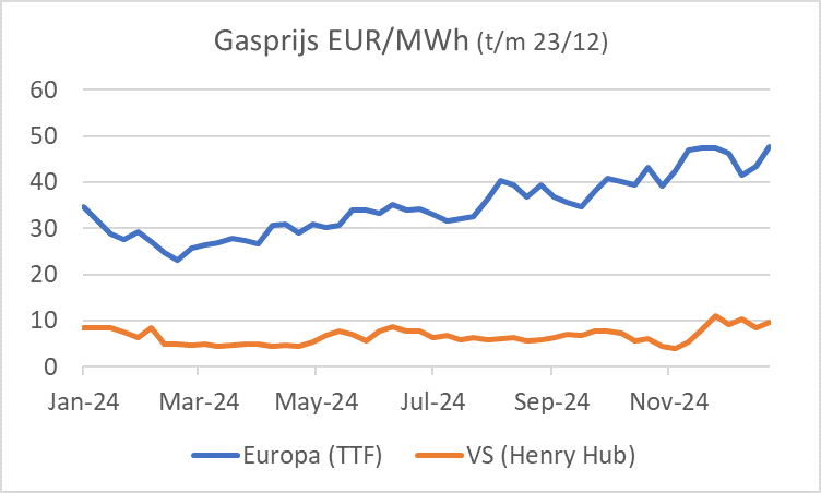 Nu lees ik allerlei verhalen dat het met Europa dit jaar wellicht juist beter zal gaan. Dat lijkt mij grotendeels 'wishful thinking'. Ik hou het op een doormodder-scenario voor Europa. Zeker, de gedaalde inflatie en de verbetering van de koopkracht zullen leiden tot een wat sterkere groei van de consumptieve bestedingen, maar Europa blijft worstelen met een aantal problemen. De gasprijs is er zo een. Die is er in de loop van 2024 niet beter op geworden. Momenteel is de Europese gasprijs meer dan vier keer zo hoog als in de VS.