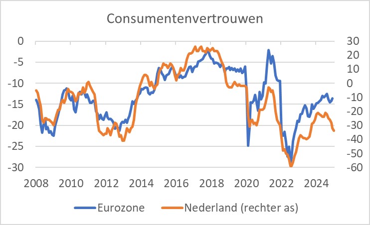 Nederlandse consumenten worden steeds somberder. Dat is opmerkelijk want de koopkracht stijgt. De chaotische politieke ontwikkelingen bij ons, de handelsoorlog van Trump en de gepercipieerde dreiging van een echte oorlog spelen hier waarschijnlijk een doorslaggevende rol.