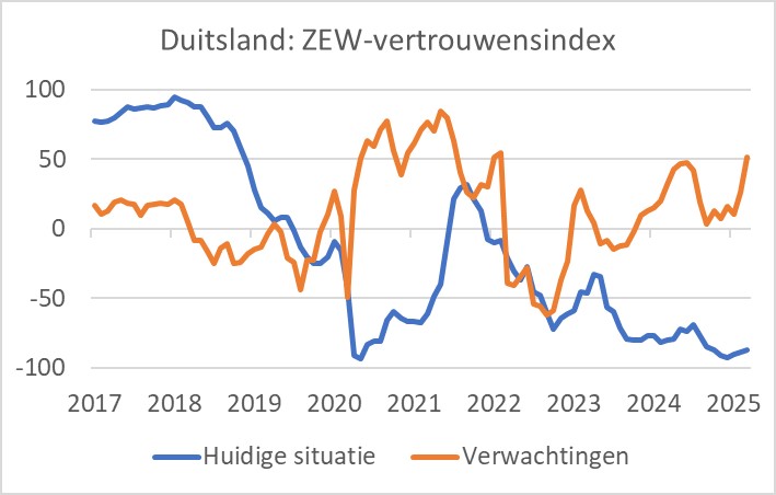Analisten worden een stuk positiever over de vooruitzichten voor de Duitse economie. De plannen van de nieuwe regering onder leiding van Friedrich Merz zijn aanleiding voor een uitzonderlijk forse stijging van de verwachtingen-component van de ZEW-index. Een stijging zoals de index laat zien over januari en februari samen, komt zelden voor.