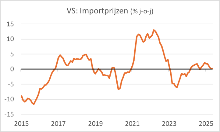 Inmiddels zijn er zo her en der cijfers gepubliceerd waarvan je mag vermoeden dat die de eerste effecten van de heffingen op prijzen laten zien. Neem de importprijzen in de VS over de maand mei. Ik moet toegeven dat ik niet precies weet hoe dit exact wordt gemeten. Maar die Amerikaanse importprijzen waren in mei gelijk aan die in januari en slechts 0,2% hoger dan een jaar eerder. Ook maand-op-maand was er niets bijzonders zichtbaar.