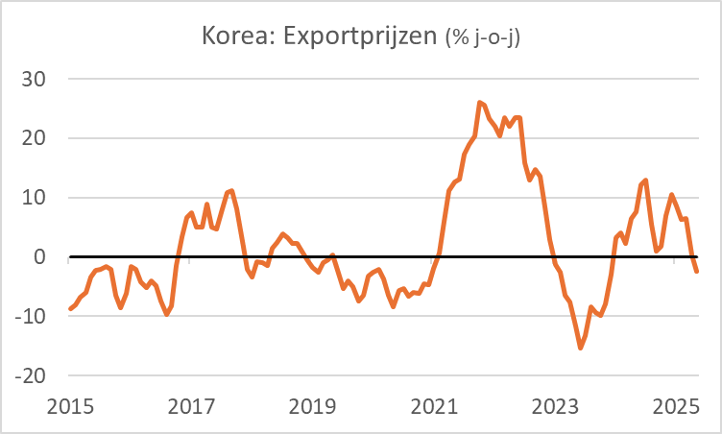 Korea heeft deze week exportprijzen over mei gepubliceerd. Die waren iets lager dan in mei vorig jaar. Ook hier was absoluut geen onrustbarend beeld zichtbaar maand-op-maand. Misschien probeer ik uit deze cijfers te veel conclusies te trekken, maar de cijfers suggereren eerder dat Koreaanse exporteurs een deel van de heffing absorberen. Dat beperkt dan het effect op de Amerikaanse inflatie.