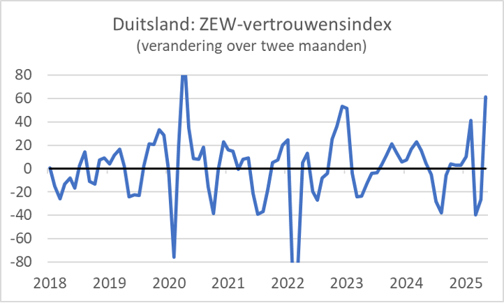 Het vertrouwen dat analisten in de Duitse economie hebben, verbetert. Eerder dit jaar was dat ook al zo ten teken van een cyclische versterking van de conjunctuur. Maar toen kwamen de 'wederkerige' importheffingen van Trump. Die gaven het vertrouwen een buitengewoon forse knauw in april. Toen de heffingen werden uitgesteld herstelde het vertrouwen weer. In mei en juni samen werd het verlies van april bijna goed gemaakt. Zo blijven de vooruitzichten voor de Europese economie een speelbal van de grillen van Trump. Maar: so far, so good.