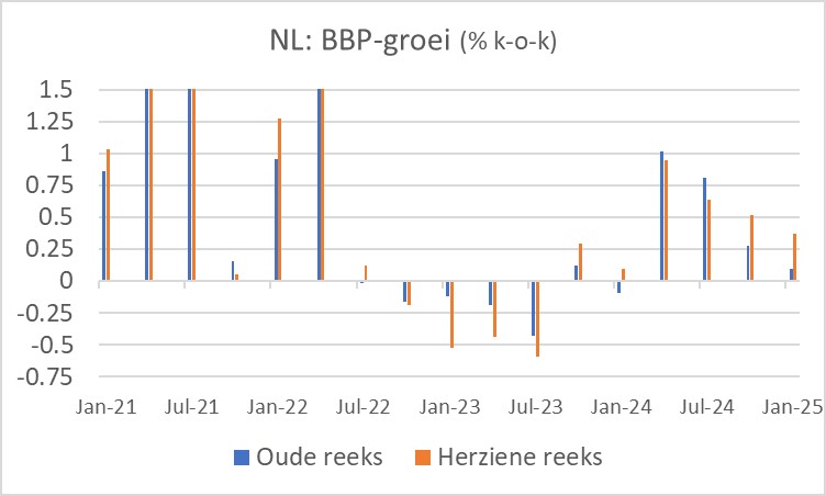 Ook zijn de cijfers over drie eerdere jaren herzien. Dat levert eveneens aanzienlijke verschuivingen op. Tot nog toe stond in de boeken dat onze economie in 2023 met 0,1% is gegroeid. Dat blijkt nu een krimp van 0,6% te zijn. Dat scheelt. De groei in 2024 is juist licht opwaarts herzien: van 1,0% naar 1,1%.