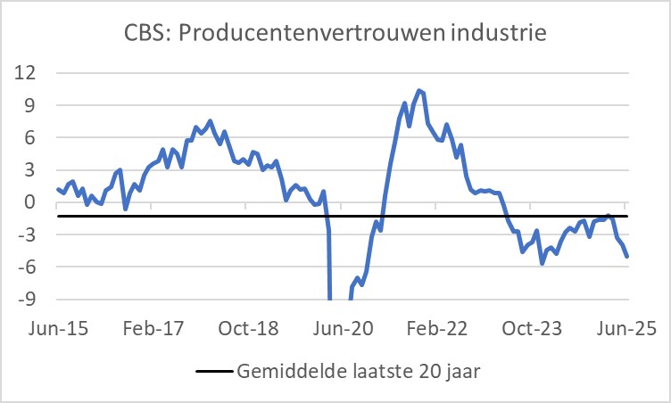 De opwaartse herziening van het groeicijfer over het eerste kwartaal ten spijt, industriële ondernemers worden er niet vrolijker op. De index die het producentenvertrouwen in de industrie meet, daalde in juni voor de vierde maand op rij: van -3,9 in mei naar -5,0. Het gemiddelde over de afgelopen twintig jaar is -1,3. Producenten werden vooral negatiever over de verwachte productie en hun orderportefeuille. Het is te hopen dat verminderde geopolitieke onzekerheid, respectievelijk het zicht op de-escalatie in de handelsoorlog en de lagere olieprijzen (vooral in euro's) de conjunctuur op kort termijn een steuntje in de rug kunnen geven.