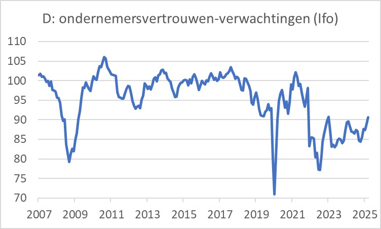 In tegenstelling tot Nederlandse industriële ondernemers, zijn Duitse ondernemers in juni juist optimistischer geworden volgens de Ifo-index. Die index verbeterde van 87,5 in mei naar 88,4. De belangrijke verwachtingen-component verbeterde opvallend sterk: van 89,0 naar 90,7. Er dient wel gezegd dat vooral ondernemers in de dienstensector en de bouw optimistischer werden. De sub-index voor de industrie verbeterde slechts marginaal. Het afwijkende patroon tussen het vertrouwen in Nederland en Duitsland kan wellicht worden verklaard uit het eerder achterblijven van de Duitse vertrouwensindex en het beleid van de nieuwe regering Merz.