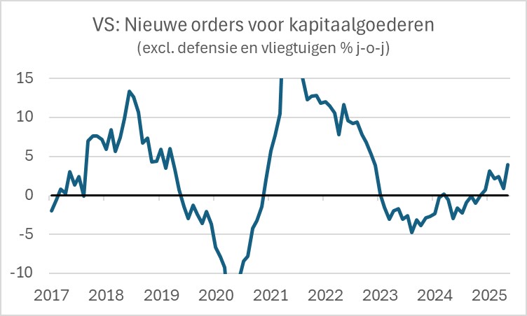 Het beeld van de Amerikaanse economie blijft 'gemengd'. Aan de positieve kant dient opgemerkt te worden dat bedrijfsinvesteringen lijken aan te trekken. Dat valt af te leiden uit het volgende plaatje van de groei van de orders voor kapitaalgoederen (exclusief defensie en vliegtuigen).