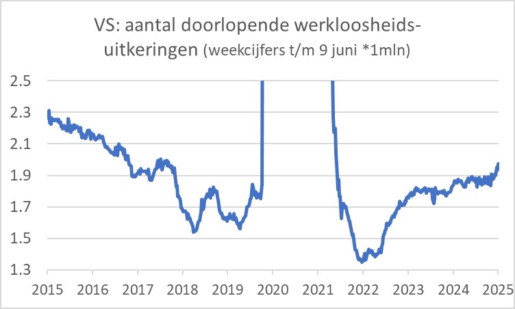 Anderzijds lijkt de arbeidsmarkt te verzwakken. Het is niet zo dat er veel ontslagen vallen, maar werklozen vinden het lastiger om een nieuwe baan te vinden. In zijn laatste persconferentie vorige week maakte Fed-baas Powell daarover al een opmerking. Deze week bleek dat het aantal doorlopende werkloosheidsuitkeringen weer verder is gestegen. In de week van 9 juni werd een totaal van 1,974 mln bereikt, het hoogste niveau sinds november 2021. Aangezien het realiseren van maximale werkgelegenheid een kerntaak van de Fed is, brengt dit renteverlagingen dichterbij.