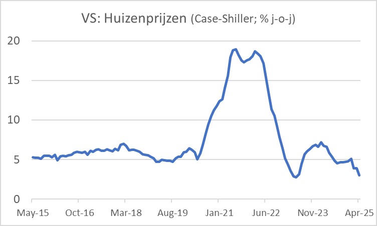 Ook de Amerikaanse huizenmarkt verzwakt iets. Het tempo van prijsstijgingen vermindert. Op de zogeheten Case-Shiller maatstaf waren huizen in april 3,4% duurder dan een jaar eerder, tegen 4,1% in maart. Dit is allemaal geenszins een drama, maar de richting is hier wel duidelijk en ook deze ontwikkeling pleit voor renteverlaging.