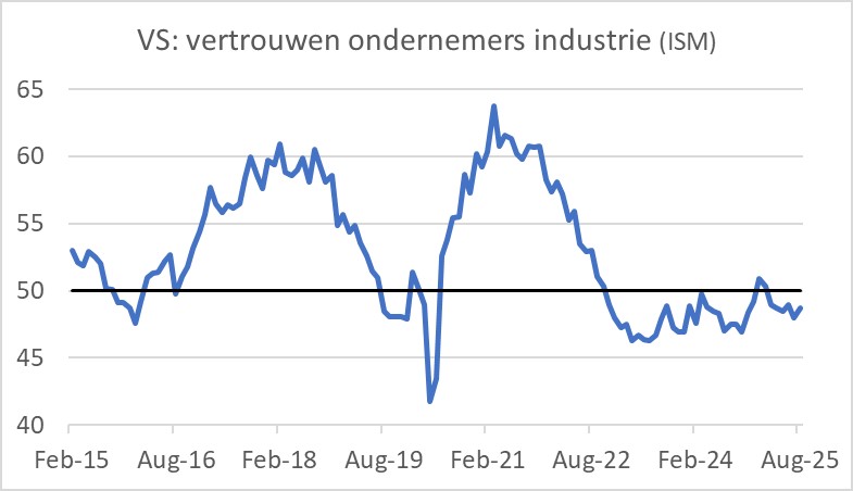 Eerlijk gezegd houdt het in de VS ook niet over. Het Beige Book van de Fed beschrijft heel magere groei, een stagnerende arbeidsmarkt en stijgende kosten voor bedrijven, onder andere door de importheffingen van Trump. De president wil de industriële bedrijvigheid in de VS stimuleren. Dat gaat natuurlijk niet van de ene dag op de andere, maar tot dusver zijn de ontwikkelingen teleurstellend. Het vertrouwen van industriële ondernemers is in augustus weliswaar iets gestegen volgens de inkoopmanagersindex van de ISM (Institute for Supply Management), maar blijft met 48,7 onder het draaipunt van 50. Als vuistregel geldt dat alles onder de 50 niet goed is en alles boven 50 op groei duidt. Die 48,7 van augustus is wel beter dan de 48,0 van juli.