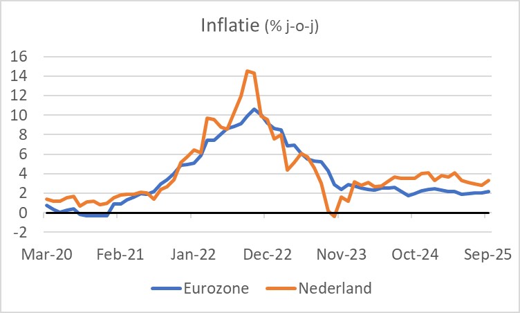 Minder positief is de ontwikkeling van de inflatie in ons land. Na enkele maanden waarin de inflatie geleidelijk is gedaald, liep deze in september juist weer op. En niet zo zuinig ook. In augustus bedroeg de inflatie 2,8%, in september 3,3%. Ook in de eurozone liep de inflatie op, maar minder hard dan bij ons: van 2,0% in augustus tot 2,2% in september.