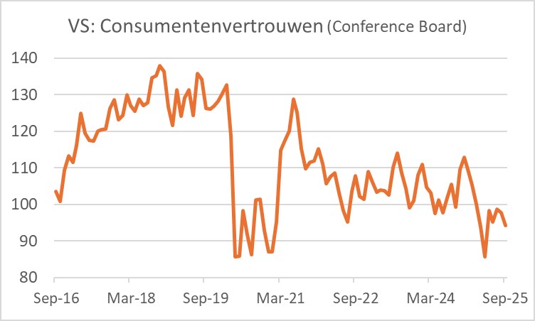 Volgens de index van de Conference Board is het consumentenvertrouwen in september gedaald tot 94,2. In augustus stond er nog 97,8. De grafiek laat zien dat het niveau van de index laag is in een historisch perspectief.
