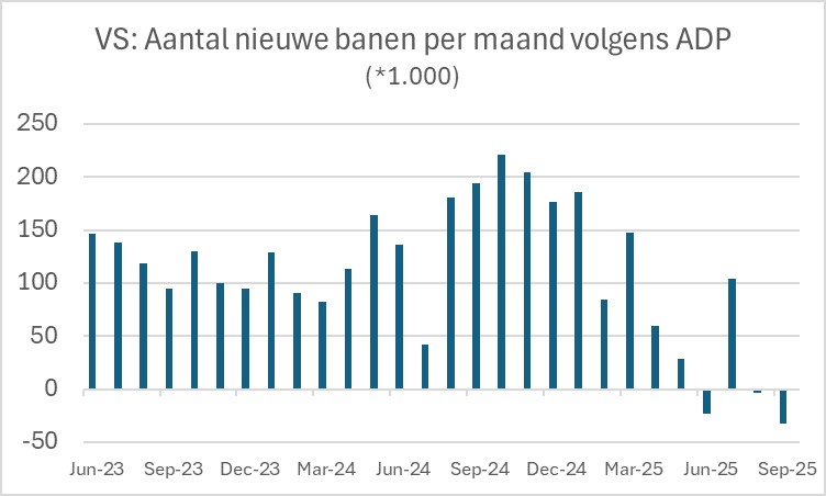 De arbeidsmarkt wordt er niet sterker op. Vandaag zou het Bureau of Labor Statistics (BLS) cijfers publiceren over de banengroei, maar dat gaat niet gebeuren vanwege de shutdown. Loonstrookjesverwerker ADP gaat uiteraard gewoon door. Zij rapporteerden dat er in september 32.000 minder banen waren dan in augustus. De laatste zes maanden is de banengroei volgens deze cijfers behoorlijk teruggevallen. Dat suggereert dat Trump ongelijk heeft als hij stelt dat de BLS met de cijfers over de banengroei heeft zitten rommelen om de president in een kwaad daglicht te stellen. Van manipulatie van de data zal bij ADP immers zeker geen sprake zijn.