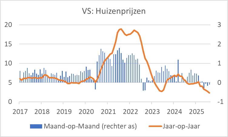 Ook de Amerikaanse huizenmarkt verzwakt. Op de maatstaf van de Federal Housing Finance Agency daalden de prijzen in juli met 0,1% maand-op-maand, de vierde maand op rij met een daling. Jaar-op-jaar is nog altijd sprake van een stijging, maar die matigt zich: van 2,7% in juni tot 2,3% in juli. De verzwakking van de huizenmarkt zal voor de Fed mogelijk een overweging zijn om ook in de laatste maanden van het jaar de rente te verlagen.