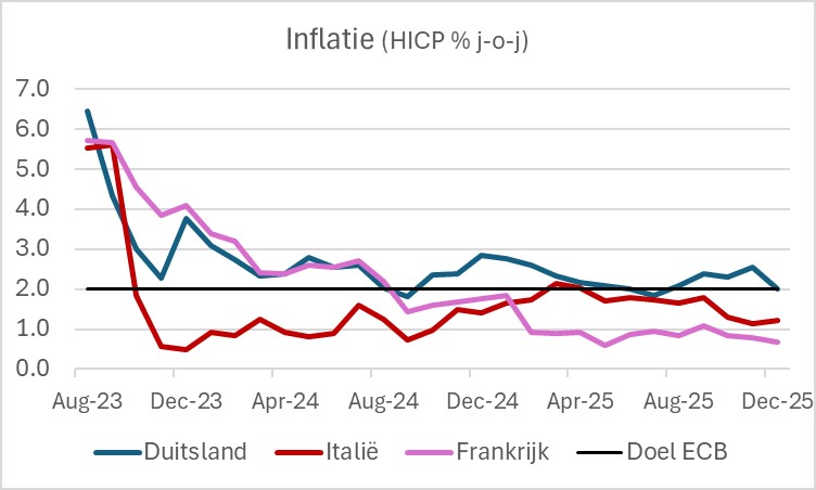 Duitsland, Frankrijk en Italië, samen goed voor meer dan de helft van de economie in de eurozone, hebben inflatie onder of precies op de 2%-doelstelling van de ECB. In Duitsland daalde de inflatie volgens de HICP-maatstaf van 2,6% in november naar 2,0% in december. Volgens de nationale maatstaf daalde de inflatie van 2,3% naar 1,8%. In Frankrijk en Italië heeft de inflatie de laatste twee jaar vaker onder dan boven de doelstelling van de ECB gelegen. In december bedroeg de inflatie in Frankrijk 0,7% en in Italië 1,2%. De hoogste inflatie is te vinden in Estland en Slowakije: 4,1%. Van de meer gevestigde, 'oude' economieën had Spanje in december een inflatiepercentage van 3,0% en Oostenrijk 3,9%.