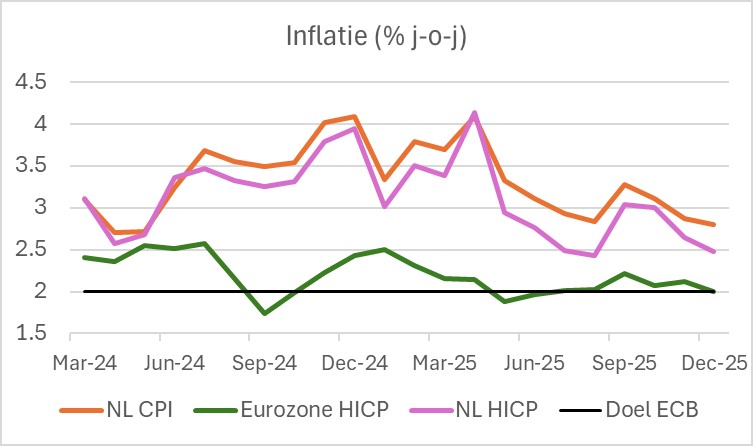 Onze inflatie is in december uitgekomen op 2,8%, iets lager dan de 2,9% in november. Volgens de Europese HICP-maatstaf daalde onze inflatie van 2,6% in november naar 2,5% in december. De inflatie voor de eurozone als geheel daalde van 2,1% in november tot 2,0% in december. Onze inflatie ligt dus nog steeds boven die in de eurozone, al is het verschil niet meer zo groot als in 2024 en het eerste deel van 2025. Als je alle eurolanden op een rijtje zet, zitten we redelijk in het midden. In acht landen is de inflatie in december lager dan bij ons, in elf landen is ze hoger.