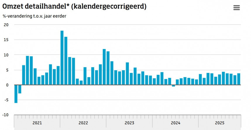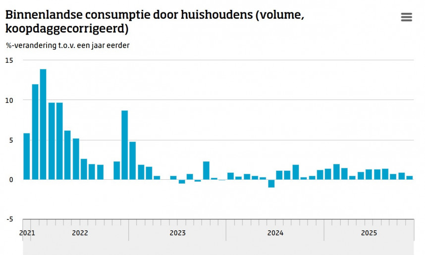 De consumptie van huishoudens is in november in volume met 0,5% gestegen ten opzichte van een jaar eerder. Dat is nogal mager en het was het laagste groeicijfer van het jaar. De detailhandelsomzetten waren juist sterk gegroeid in november: met 3,9% ten opzichte van een jaar eerder, een van de hoogste percentages van het jaar. Overigens betreft dat cijfer een nominale grootheid. In volume zette de detailhandel 2,6% meer om. Dat ligt ruim boven de 0,5% van de groei van de totale consumptieve uitgaven, wat de vraag oproept waardoor dat verschil wordt veroorzaakt. Het antwoord is waarschijnlijk 'het weer'. In november was het gemiddeld 0,7 graden warmer dan normaal. Daardoor hoefden huishoudens minder te stoken en dat drukt de consumptieve bestedingen, maar niet de detailhandelsomzet.