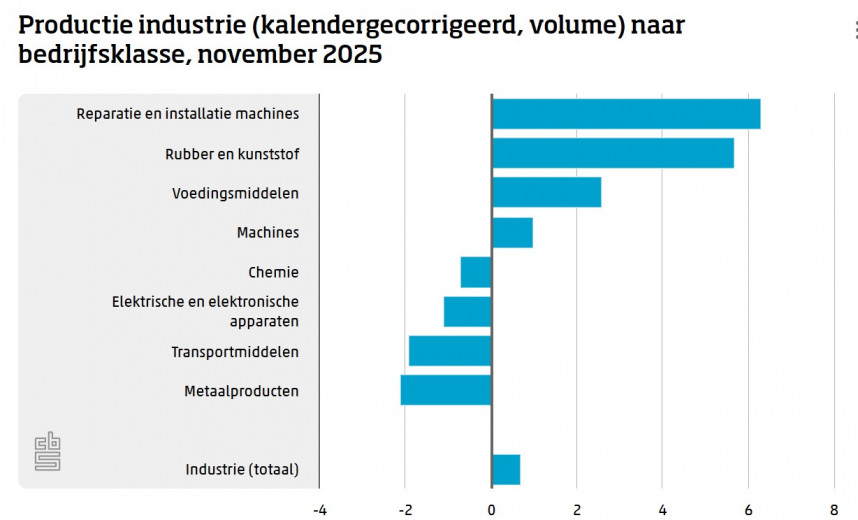 De industriële productie in ons land lag in november 0,9% hoger dan een jaar eerder. Ten opzichte van oktober daalde de productie juist met 0,5%. De index belandde daardoor op het laagste niveau in vier maanden. Ondernemers in de industrie werden in december minder somber. De index van het ondernemersvertrouwen verbeterde van -1,7 in november tot -1,1 in december, zelfs een fractie hoger dan het langjarige gemiddelde. Ondernemers waren vooral positiever over hun orderontvangsten.