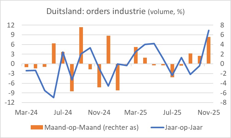 Dat Nederlandse ondernemers in december positiever waren over hun orderportefeuille lijkt mooi te sporen met Duitsland. In elk van de drie maanden tot en met november rapporteren Duitse industriële ondernemers stijgende orderontvangsten. In november was sprake van een volumestijging van 5,6% ten opzichte van oktober. Ten opzichte van een jaar eerder werd een plus van 10,3% geboekt. Dat is heel stevig, al lag het wel vooral aan orders voor grote goederen. Die kunnen volatiel zijn en het totale cijfer sterk beïnvloeden. Als orders voor zaken als treinen, schepen etc. buiten beschouwing worden gelaten, resulteert toch nog steeds een plus van 0,7% in december. Binnenlandse orders namen met 6,5% toe, die uit andere EU-landen met 8,2% en die uit niet-EU-landen met 2,9%. Dat ziet er mooi uit voor Duitsland, waar goed economisch nieuws schaars is.