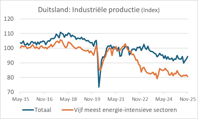 Onze industriële productie lag in november iets hoger dan een jaar eerder, maar lager dan in oktober. De Duitse industrie maakt een kleine opleving door. Er worden vooral meer orders geboekt en de productie stijgt ook. Reden voor euforie is dat bepaald nog niet. We zullen zien of de verbeteringen doorzetten.