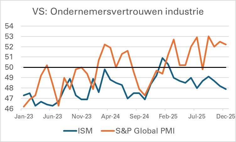 Wat moet ik deze week schrijven over de VS? Venezuela, Groenland, ik laat het maar voor wat het is. Volgens de maatstaf van het ISM (Institute for Supply Management) is het vertrouwen van ondernemers in de industrie in december verder gedaald. Van 48,2 in november zakte de index naar 47,9 in december. Op een korte periode eerder in 2025 na noteert deze index al lang onder de 50. Dat suggereert krimp in de sector. De harde cijfers over productie bevestigen dat niet. Die laten gematigde groei zien. S&P Global produceert maandelijks een rivaliserende index, de PMI (Purchasing Managers Index). Die ligt ruim boven de 50, wat robuuste groei suggereert. Maar zo sterk groeit de productie van de Amerikaanse economie ook weer niet. Het is mij niet duidelijk wat het nu wel erg grote verschil tussen beide indices veroorzaakt. De realiteit lijkt in het midden te liggen.