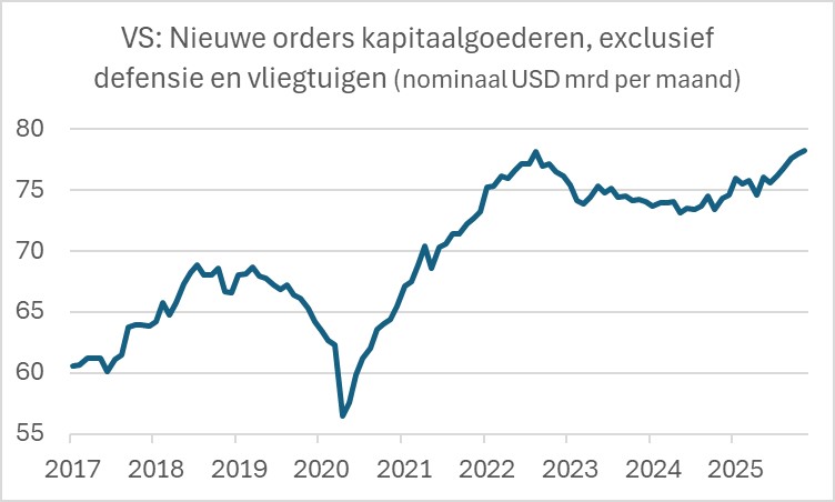 Het gaat ook goed met de Amerikaanse arbeidsproductiviteit. Hoewel je altijd voorzichtig moet zijn met het duiden van deze cijfers op de korte termijn, lijkt de verbetering van de productiviteit aan vaart te winnen. In het derde kwartaal van 2025 lag de arbeidsproductiviteit in de verwerkende industrie 2,4% hoger dan een jaar eerder, het beste cijfer sinds 2021 toen de cijfers geflatteerd werden door het herstel na de coronacrisis. Zulke sterke groei is uitstekend nieuws, onder andere voor de president. Hoge productiviteitsgroei zet neerwaartse druk op de inflatie en dat vergroot de kans op renteverlagingen door de Fed. Hoge productiviteitsgroei is ook gunstig voor de winstgroei van bedrijven. Dat ondersteunt aandelenkoersen en als die stijgen neemt het Amerikaanse consumentenvertrouwen meestal toe, evenals de bestedingskracht.
