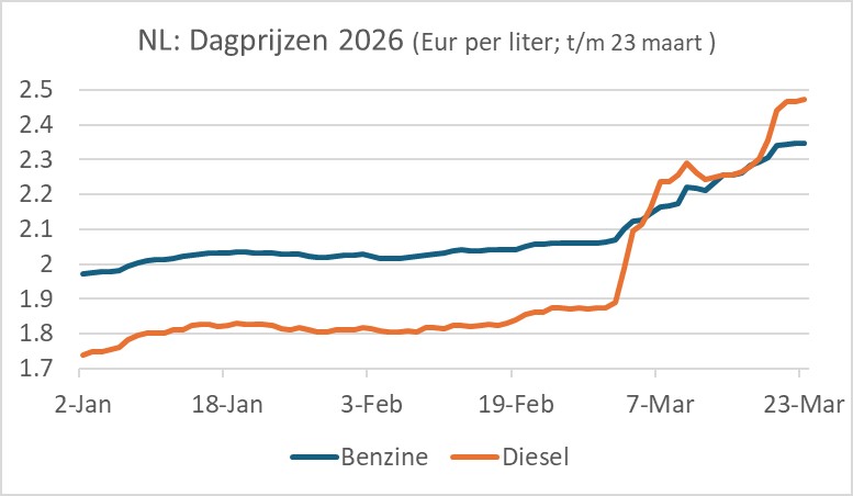 Het CBS publiceert dagprijzen voor motorbrandstoffen. De meest recente data op de site van het CBS zijn voor 23 maart. Als de prijzen voor benzine en diesel de resterende dagen in maart op het niveau van 23 maart blijven, dan ligt de gemiddelde benzineprijs in maart ruim 18% hoger dan een jaar eerder en de dieselprijs bijna 37% hoger. Dat alleen al zal ons inflatiecijfer in maart met zo'n 0,4% omhoogduwen.