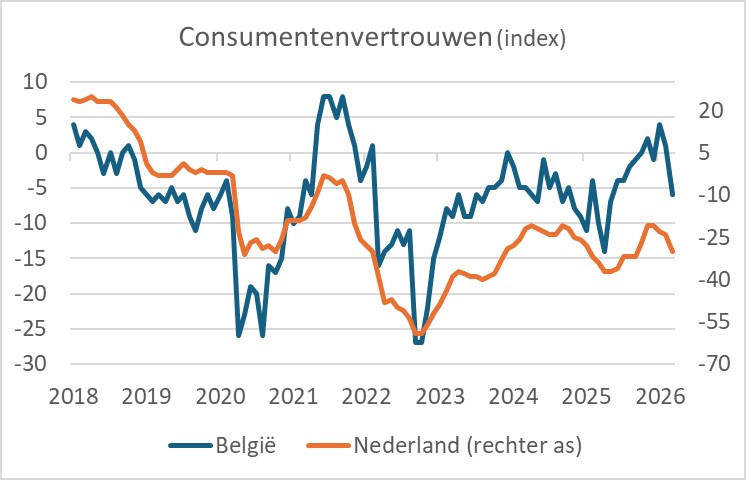 Het consumentenvertrouwen in ons land heeft in maart een knauw gekregen. Het indexcijfer zoals het CBS dat berekent, daalde van -24 in februari naar -30 in maart. Dat was het laagste niveau sinds september. Uiteraard zijn de gestegen brandstof- en energieprijzen de belangrijkste factor. Logisch dus dat ook elders het consumentenvertrouwen daalt. Voor de aardigheid heb ik het Belgische consumentenvertrouwen in de volgende grafiek opgenomen. En uiteraard zijn ook Belgische consumenten minder positief geworden in maart. De index van het Belgische consumentenvertrouwen is zelfs harder gedaald dan bij ons, maar de Belgische index was daarvoor wat harder opgelopen. Het niveauverschil van beide lijnen in de grafiek heeft geen betekenis, dat is een kwestie van verschillende schalen en assen. De vraag kwam wel even in mij op of ik liever Bart De Wever of Rob Jetten als premier zou willen…(retorische vraag…)
