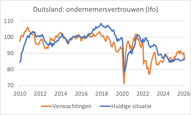 Ondernemers worden ook niet vrolijk van de hogere energieprijzen. In Duitsland daalde de Ifo-index van 88,4 in februari naar 86,4 in maart. De beoordeling van de huidige situatie bleef opvallend genoeg stabiel, maar de subindex die de verwachtingen meet, duikelde van 90,2 in februari naar 86,0 in maart. Zo'n grote daling in één maand komt niet vaak voor, maar werd nog wel ruim overtroffen na het uitbreken van de pandemie en de Russische inval in Oekraïne.