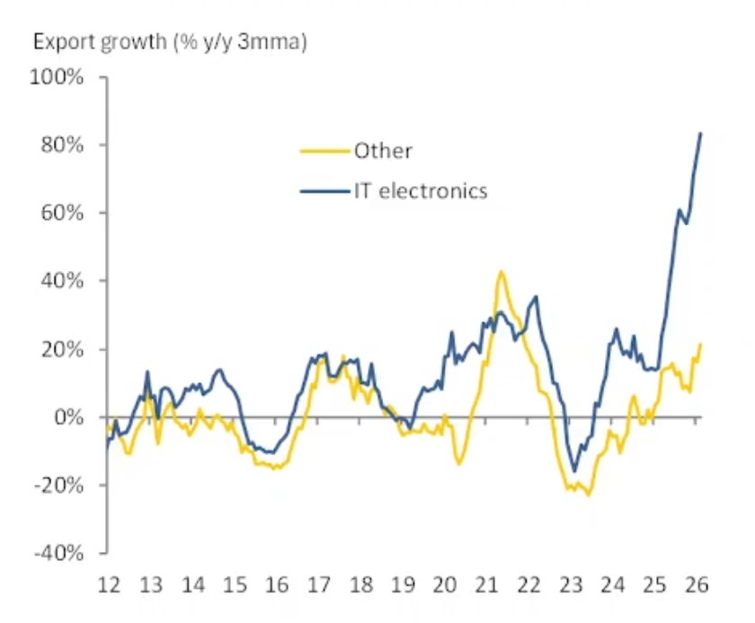 Een bevriende econoom die in Azië woont en zich op die economieën richt, stuurde mij deze week een paar plaatjes die bevestigen dat er momenteel een heel sterke groei is in de handel in producten die met AI te maken hebben. Het volgende plaatje laat de groei van de export van Taiwan zien, onderverdeeld in IT-elektronica en de rest. Dit betreft dus nominale bedragen en een prijseffect bij halfgeleiders flatteert de cijfers ongetwijfeld. Hij meent echter dat dat meer geldt voor Korea dan Taiwan. Ook hier zeg ik: wordt vervolgd.