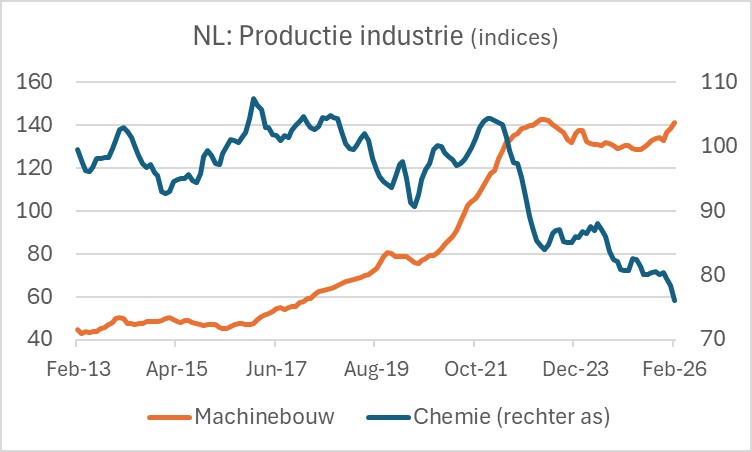 De machinebouw zal ongetwijfeld blijven profiteren van de snelle groei van de uitgaven die bedrijven aan AI wereldwijd doen. De chemie daarentegen zit al tijden in de hoek waar de klappen vallen. De meest recente cijfers hebben betrekking op februari, dus van voor de stijging van de energieprijzen. Je houdt je hart vast. Krijgt de energie-intensieve industrie een nieuwe klap? Misschien dat dat op korte termijn meevalt. Ik lees verhalen dat er productieverstoringen in Azië zijn waardoor sommige klanten zich tot Europese leveranciers wenden. Dat heeft te maken met het feit dat verreweg de meeste olie en gas die door de Straat van Hormuz moet naar Azië gaat.