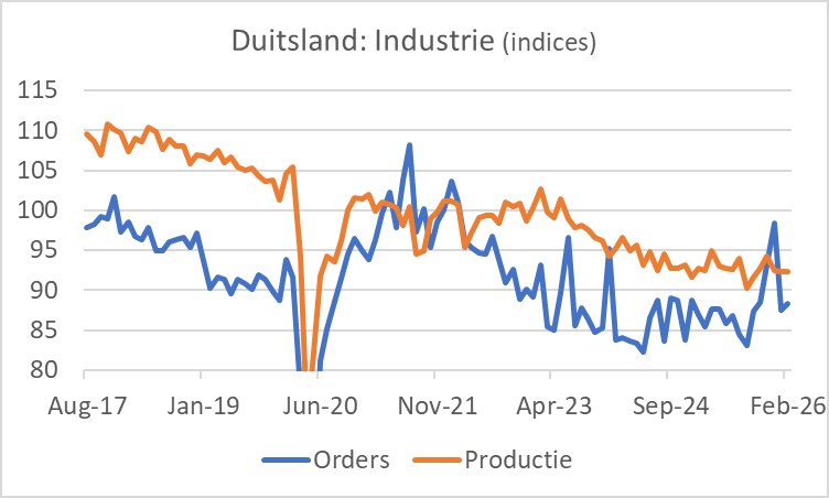 Overigens is het bij onze oosterburen niet veel beter gesteld met de industrie. Daar daalde het productievolume in februari met 0,3% ten opzichte van januari en was het gelijk aan een jaar eerder. Na een forse daling in januari herstelden de orders die bij de Duitse industrie worden geplaatst slechts marginaal.