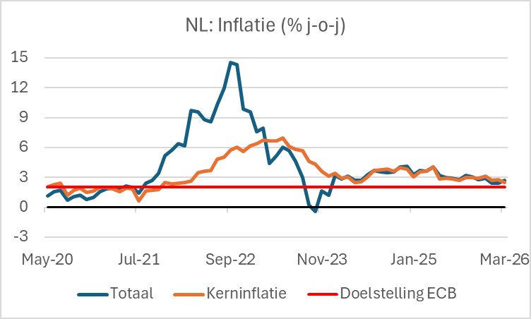 De inflatie in ons land is opgelopen van 2,4% in februari naar 2,7% in maart. Eigenlijk viel dat nog mee, want de stijging van de 'prijzen aan de pomp' duwden het inflatiecijfer met 0,4% omhoog. Het tempo van de prijsstijgingen bij diensten drukte de inflatie echter wat. Verder bieden de details weinig interessante nieuwe inzichten. Er zijn nog geen duidelijke tekenen dat de gestegen energieprijzen al breder doorwerken in de economie, los van de pompprijzen. Maar dat gaat de komende maanden ongetwijfeld komen. Uiteraard hangt veel af van wat er verder gebeurt met de olie- en gasprijzen. Er wordt gezegd dat die, zelfs als de Straat van Hormuz snel weer opengaat, nog lang hoog zullen blijven. In dat geval ga ik ervan uit dat we later dit jaar inflatiecijfers van zo'n 5% zullen zien. Ben benieuwd hoe daar in loononderhandelingen op gereageerd zal worden. In de persberichten van werkgeversorganisatie AWVN wordt nu al steen en been geklaagd over de loonstijging.
