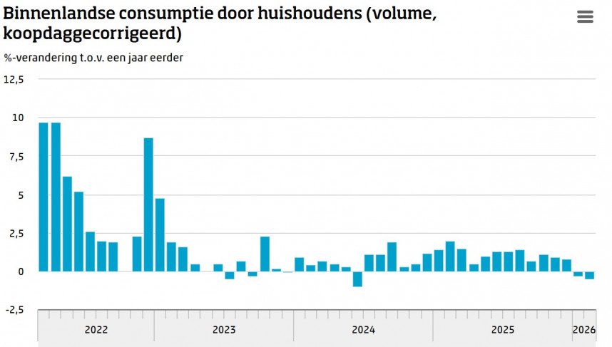 De Nederlandse consument laat zich ook al niet van zijn beste kant zien. Het volume van de consumptieve uitgaven van huishoudens lag in februari 0,5% lager dan een jaar geleden. Dat was de tweede opeenvolgende maand met een daling. Volgens het recent gepubliceerde Centraal Economisch Plan van het CPB stijgt de koopkracht dit jaar met 1,4%. Dan is een daling van de consumptieve uitgaven een teleurstelling. En dat is dan ook nog allemaal van voor de stijging van de energieprijzen.
