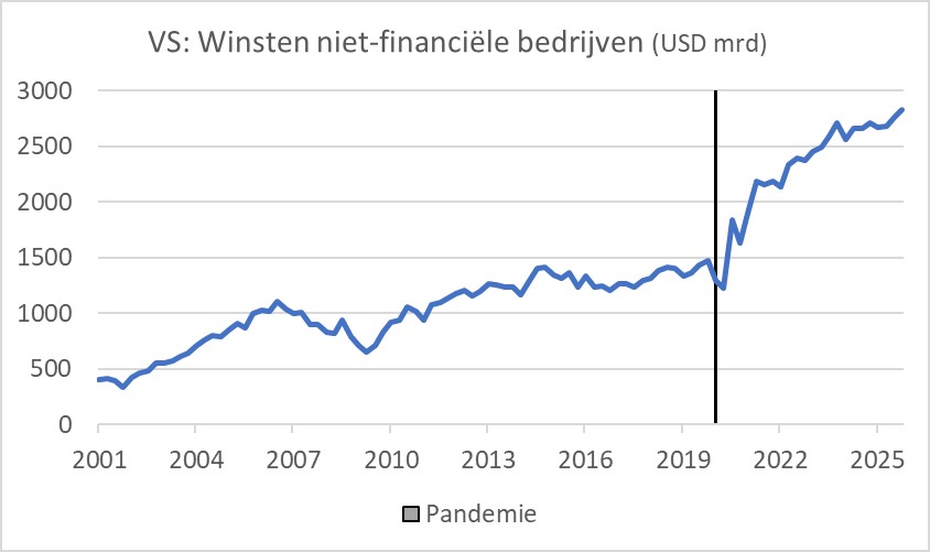 Ook elders hebben recente cijfers voornamelijk betrekking op de periode voor de hogere energieprijzen. En die cijfers zeggen dus allemaal niet zoveel. Ik beperk me daarom tot een plaatje dat ik niet vaak toon: de winsten van Amerikaanse niet-financiële bedrijven, zoals die gerapporteerd worden in de nationale rekeningen. De verticale lijn indiceert het uitbreken van de pandemie in het eerste kwartaal van 2020. Aandelenkoersen zijn de laatste jaren fors gestegen, behalve in 2022 toen de rente fors steeg. Aandelenkoersen worden in belangrijke mate beïnvloed door de bedrijfswinsten. Het interessante van het onderstaande plaatje is dat de bedrijfswinsten na de pandemie zeer sterk zijn toegenomen. Dat rechtvaardigt in ieder geval een belangrijk deel van de stijging van de aandelenkoersen. De meest recente gegevens uit het plaatje hebben betrekking op het vierde kwartaal 2025.