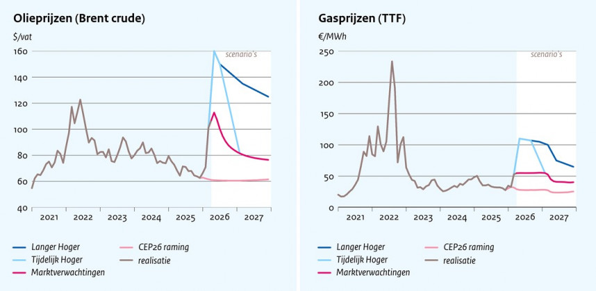 Het CPB presenteert nog twee scenario's. In beide stijgt de olieprijs naar $160 per vat, waarna een daling inzet, die in het meest sombere scenario veel langzamer gaat dat in het iets minder sombere scenario. Uiteraard loopt de inflatie het meest op in het somberste scenario (5,3% in 2026 en 3,3% in 2027). De koopkracht daalt in beide scenario's, de economische groei valt terug en in het somberste scenario doet zich een periode van negatieve groei voor, ofwel een recessie. De groeicijfers voor 2026 en 2027 als geheel komt echter niet onder nul.