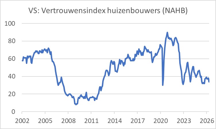 Ook het vertrouwen van huizenbouwers kreeg een tik door de hogere energieprijzen en de onzekerheid. De zogeheten NAHB-index (National Association of Home Builders) daalde van 38 in maart tot 34 in april.