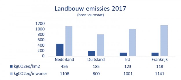 Per werkzaam persoon zijn de emissies vanuit de landbouwsector zelfs minder dan 20% dan die van de luchtvaart, 25% van de metaalsector, 6% van de raffinaderijsector en 7% van de petrochemie. Die cijfers betreffen overigens wel alleen de primaire landbouw. Als het gehele agrocomplex (onder meer dienstverlening, transport, verwerking) wordt meegerekend, dan stijgt de bijdrage aan het BBP naar 7,5% (CBS). Dit terwijl de daarmee toenemende emissies disproportioneel achterblijven.