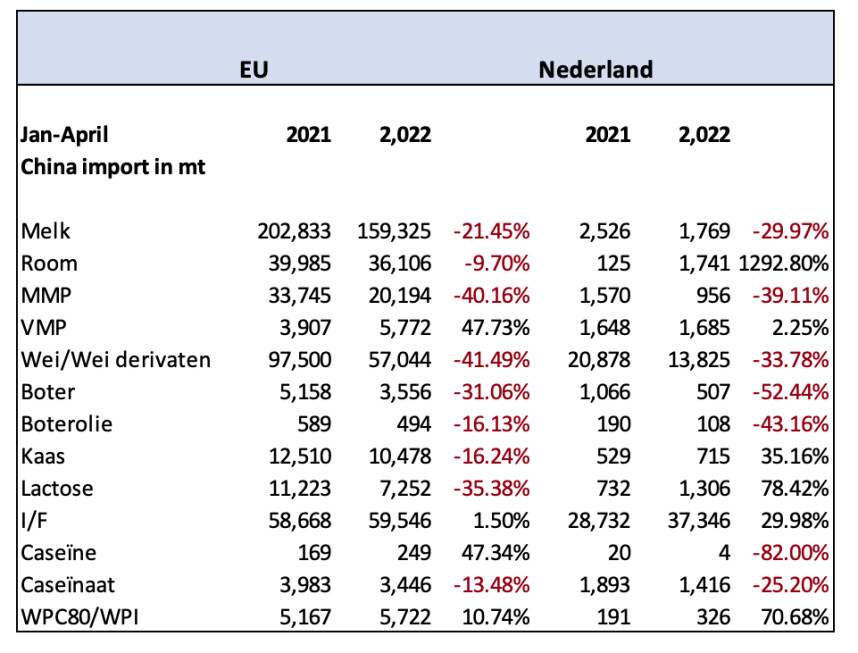 Als we kijken naar een pakket van de belangrijkste zuivelgrondstoffen in de export (mager melkpoeder (MMP), volle melkpoeder (VMP), boter, kaas, wei(derivaten) en lactose dan komt de hele EU (excl NL) uit op -11.86% in het eerste kwartaal van 2022. Nederland komt uit op -3.21%. Ter vergelijking: Duitsland komt uit op -6.62% en Frankrijk op -13,77%. Kijken we naar China, de grootste importmarkt voor zuivel, dan zijn deze effecten nog sterker.